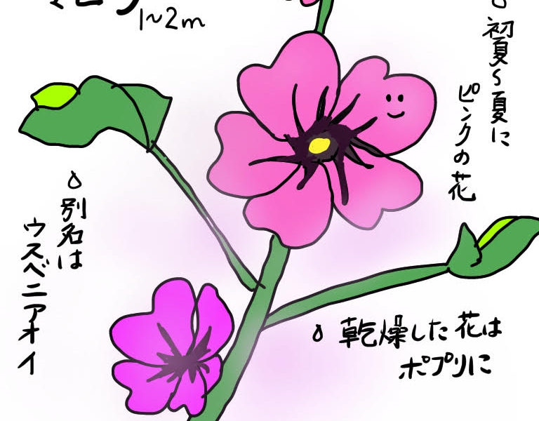 一般にコモンマロウと呼ばれる品種は、和名をウスベニアオイといいます。初夏に赤紫色の花がたくさん咲きます。花は収穫してハーブティーにも用いられます。アントシアニン色素やタンニンを含み、粘膜の保護や美肌などに効果があるといわれています。乾燥させたマロウで淹れたハーブティーにレモン汁を垂らすと、ティーの色がピンク色になって見た目にも楽しいお茶の時間を演出してくれます。