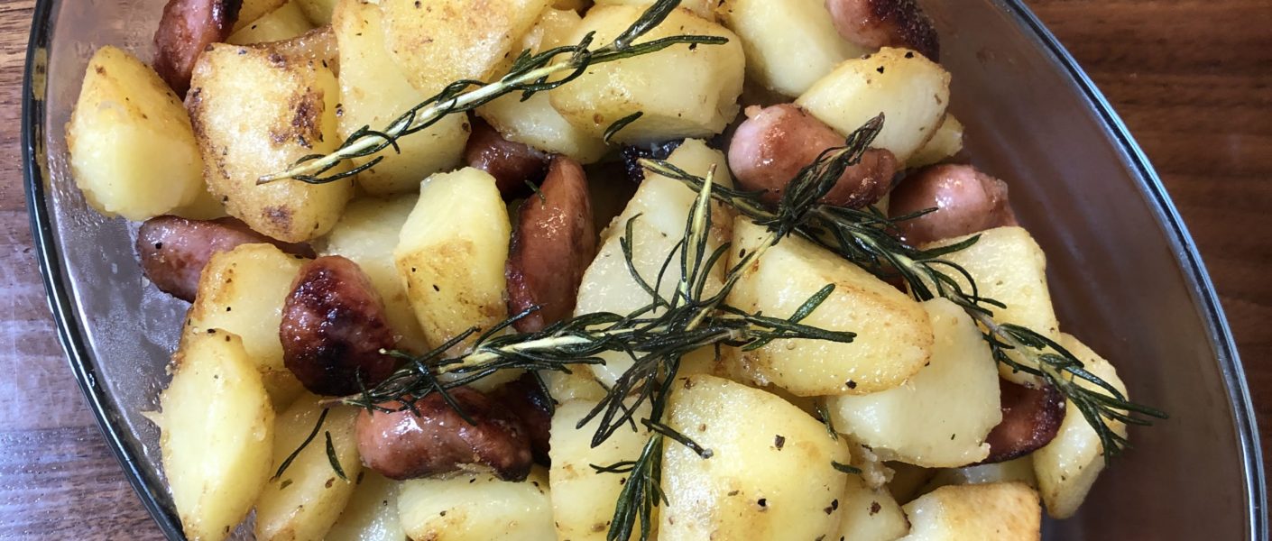 材料はジャガイモ、ソーセージ(ベーコンでも可)、ローズマリー、ニンニクです。