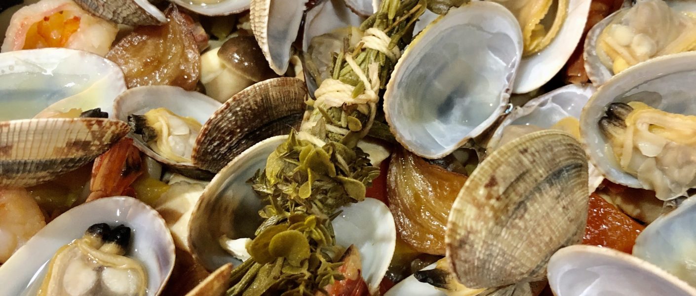 材料はエビ、アサリ(砂抜き)、鶏むね肉、シメジ、パプリカ、サフラン(なければ市販のパエリアの素でも可)、ニンニク、そしてブーケガルニです。あと、お米とオリーブオイルも必要ですね。