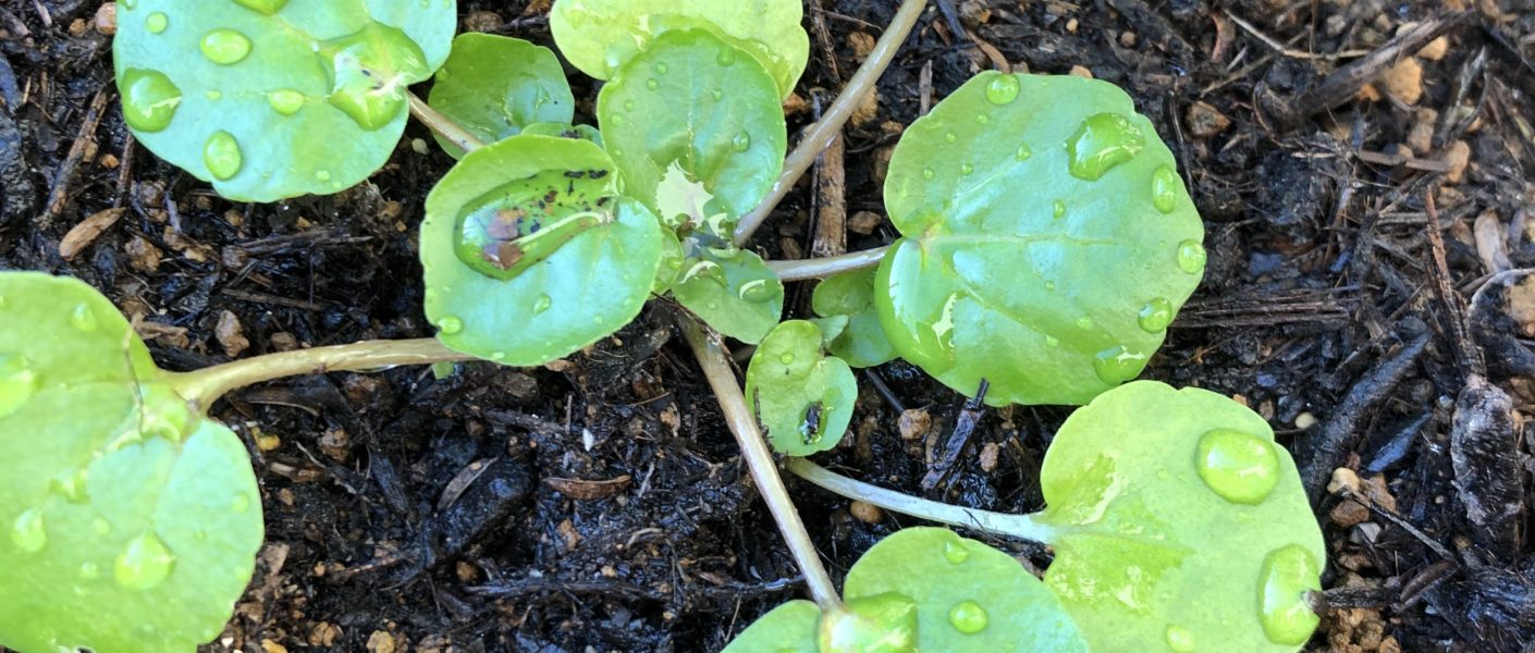 水差しで育てることも多く、畑で育てるのは簡単ではないハーブですが、現在西賀茂ハーブでは秋に撒いた種子から発芽したクレソンんの芽が成長中です。あまり日のあたらない涼しいところで水を切らさないように育てるのがポイントです。