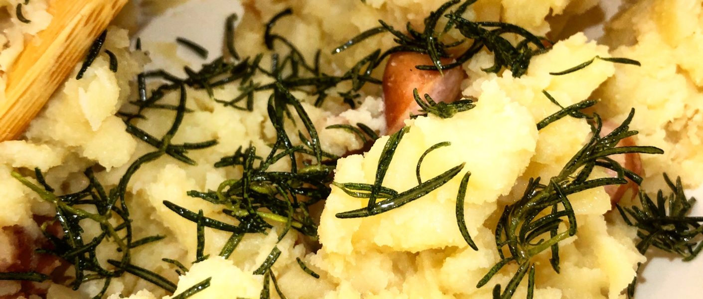 ⑤ゆであがったジャガイモをボールに移し、しゃもじなどでつぶします。そこへ③のソーセージを入れてまぜあわせます。最後に素揚げしておいたローズマリーの軸から葉を外して混ぜ込みます。(ローズマリーの軸は固いので食感を大切にするために取り除きます)